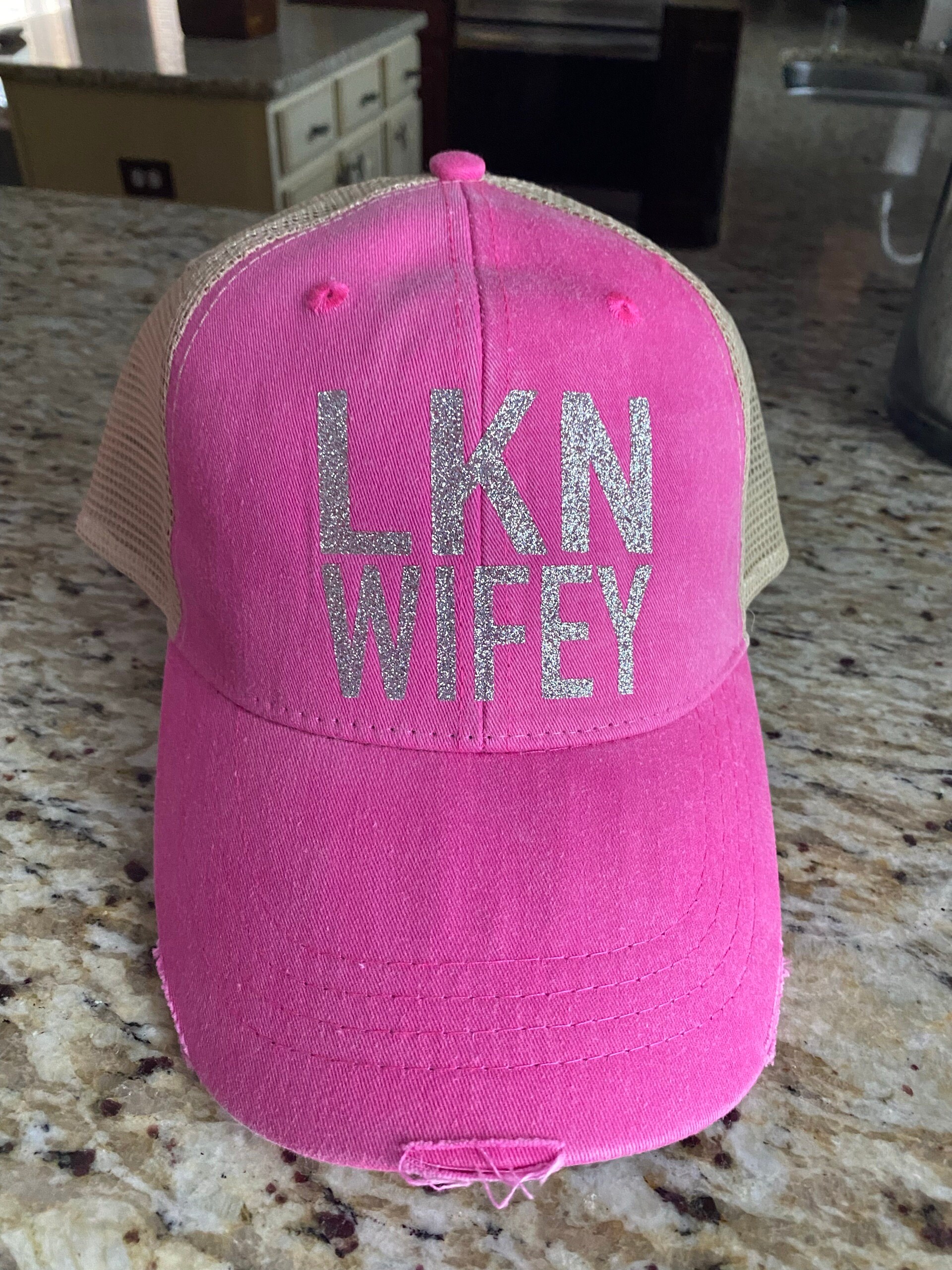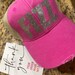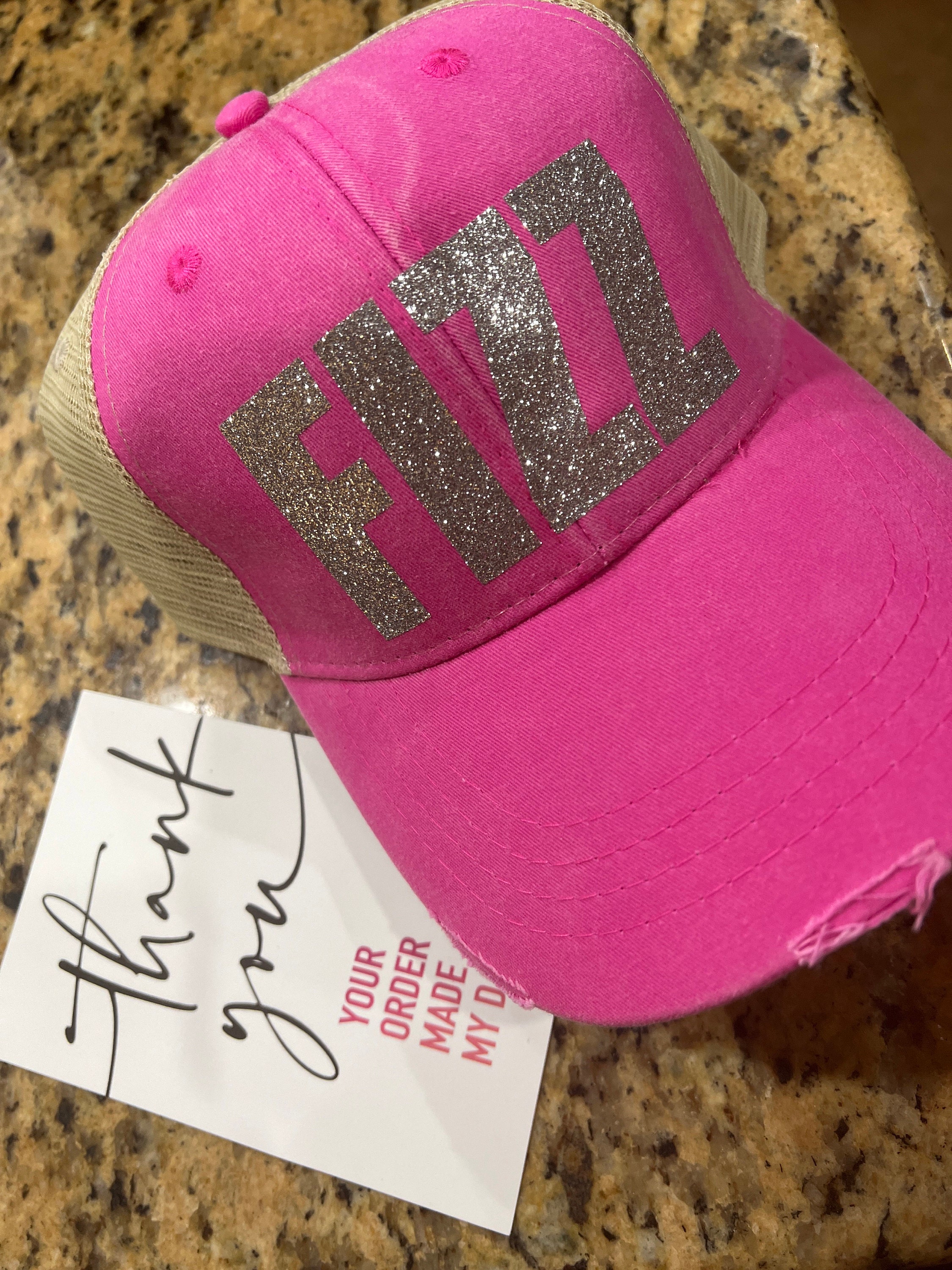 Hot Pink Distressed Trucker Hat with Mesh, Adjustable Back and Glitter FIZZ Design. This hat is fully customizable with your own saying or custom logo.
